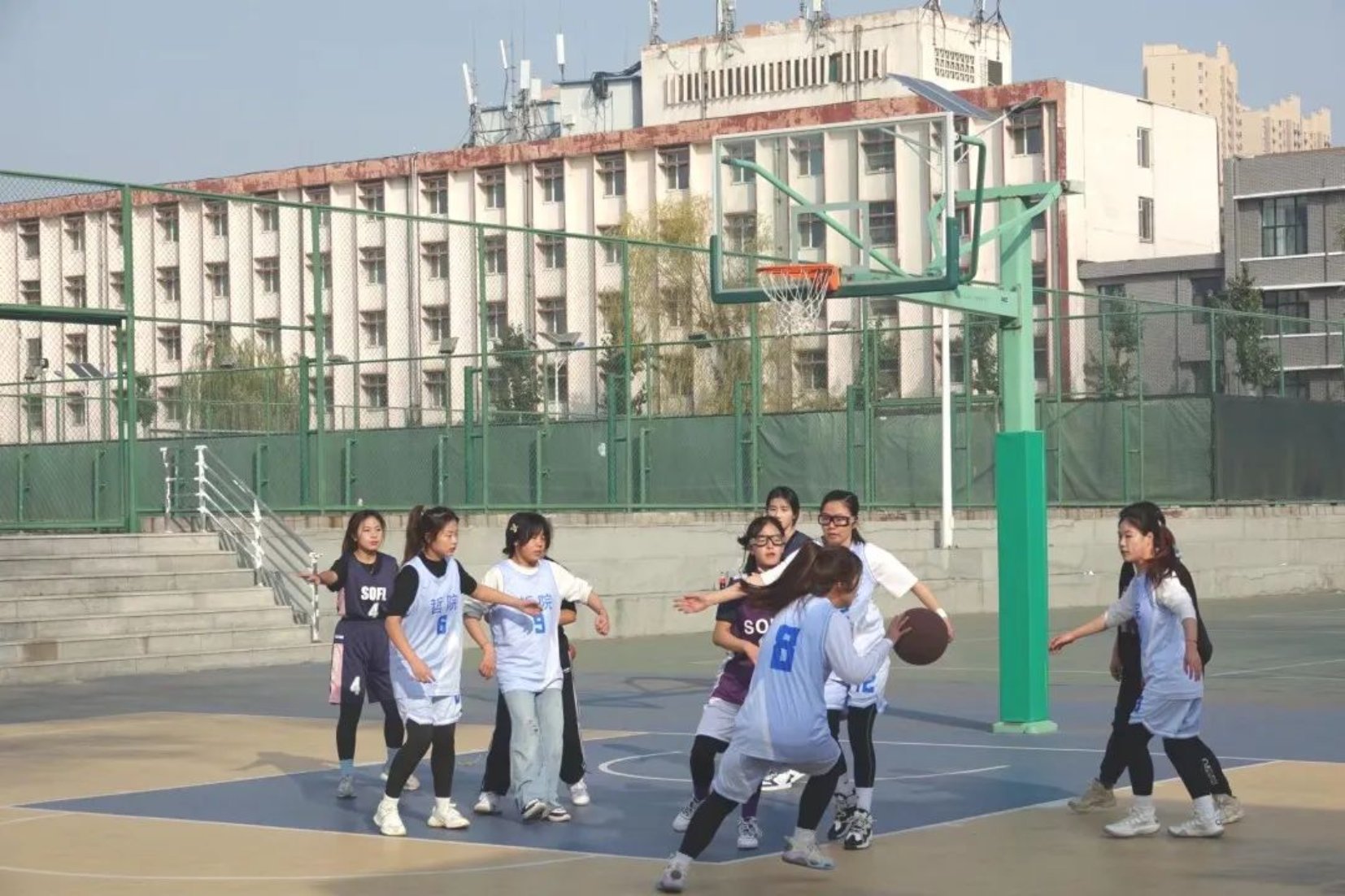 阳光正好,短暂调整过后,比赛进行到下半场。在下半场比赛中我方队员拼尽全力,积极配合,飘逸的投篮,灵活的脚步,运球、转身、防守、上篮,充分展现她们澎湃的激情。