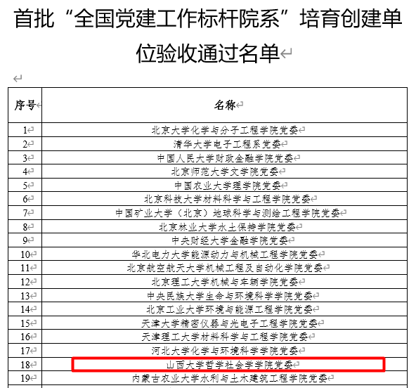 1月12日,教育部思想政治工作司发布关于首批全国党建工作示范高校、标杆院系、样板支部培育创建单位验收结果的公示,公司作为全国首批党建工作标杆院系顺利通过验收。