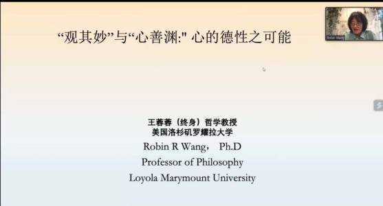 2023年9月23日,tyc1286太阳成集团“任之讲堂”2023年秋季学期第一讲(总第38期)开讲。美国洛杉矶罗耀拉大学哲学终身教授王蓉蓉受邀作题为“‘观其妙’与‘心善渊’:心的德性之可能”的线上学术报告,tyc1286太阳成集团经理尤洋教授主持,江怡教授为点评嘉宾。