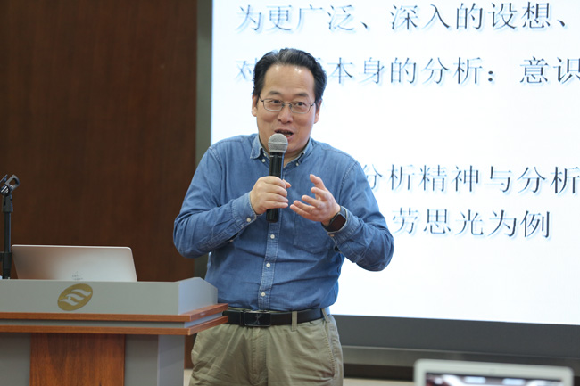 刘梁剑教授的报告为“逻辑分析内外:从金岳霖到冯契的哲学工夫”。刘梁剑教授强调哲学是一种做事,表现为相应的哲学工夫。哲学是穷理之学,它的工作方式是概念考察、逻辑分析,它的语言应该是理论语言。在以现当代中国哲学家金岳霖和冯契为例考察二者逻辑分析工夫的基础上,他认为金岳霖和冯契不仅注重逻辑分析,其同时还强调哲学概念的蕴藏、意味、情感、气味。最后,他还表示哲学运思需要真切可感的说理语言。