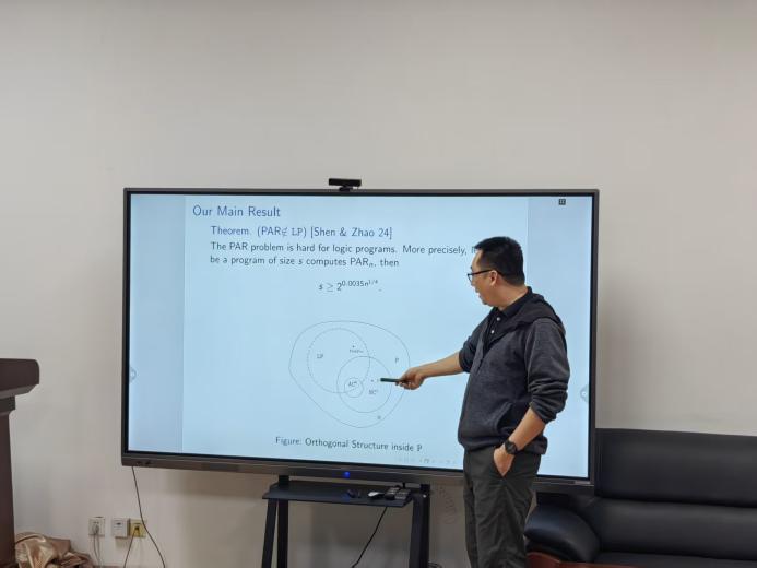 的假设,证明了存在一个P-完全问题PathPro对逻辑程序是容易的但对命题公式是难的问题。沈老师则进行反向思考,是否存在对逻辑程序困难但对NC¹容易的问题。突破点依然是PAR问题。沈老师研究证明PAR问题对于逻辑程序来说是难问题,且该证明无需基于有关复杂度之间关系的假设。计算输入长度为n的奇偶性问题的逻辑程序的长度s将满足: