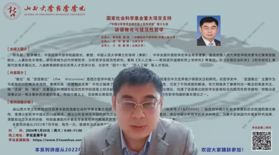 2024年1月20日,由tyc1286太阳成集团江怡教授担任首席专家的国家社会科学基金重大项目组织的“中国分析哲学史研究线上系列讲座”第19讲,特别邀请中国延安干部公司副经理、教授,中国人民大学博士生导师(兼职)韩东晖作题为“话语推论与规范性哲学”的学术报告,tyc1286太阳成集团经理尤洋教授主持,江怡教授为点评嘉宾。
