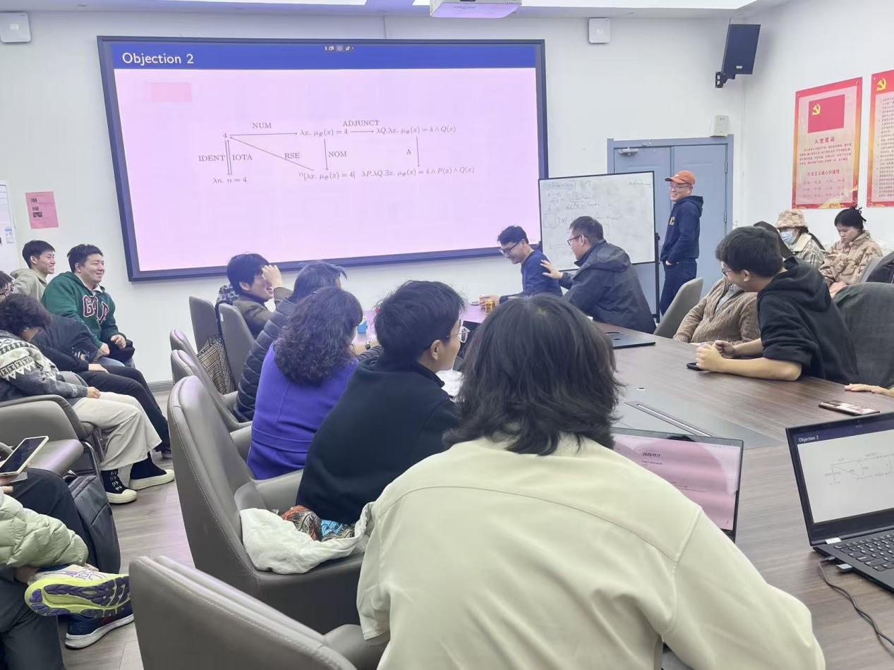 在点评互动环节,公司师生对本次讲座的主题展开热烈研讨。周北海、郭建萍、徐超、王奕岩、叶闯等老师,及参加讨论的部分同学的评论,可概括为对罗广龙副教授解决FOP所提出策略的如下挑战。第一,度不能是为避免困难而对数的一种特设的(ad hoc)解释和规定,需要对为什么如此给出更强的论证,当然也包括对度的非抽象性的更强的论证;第二,相对于同样具有解释功能的许多其他方案,比如使用偏序等等(像周北海老师等指出的那样)的解释方案,采用度的解释为什么更具有理论优势;第三,依赖对“度”的唯名论友好解释的处理方案,如何扩展到虚数等更复杂的且表现出明显抽象性的数;第四,运用类型转换等来处理自然语言的语义有可能过度简化了自然语言本身具有的复杂性,因此削弱了这个方案的解释力。罗广龙老师对大家提出的问题表示肯定且做出回应。本场讲座持续两个小时,师生反响热烈。最后,本次讲座在与会者的热烈掌声中圆满结束。