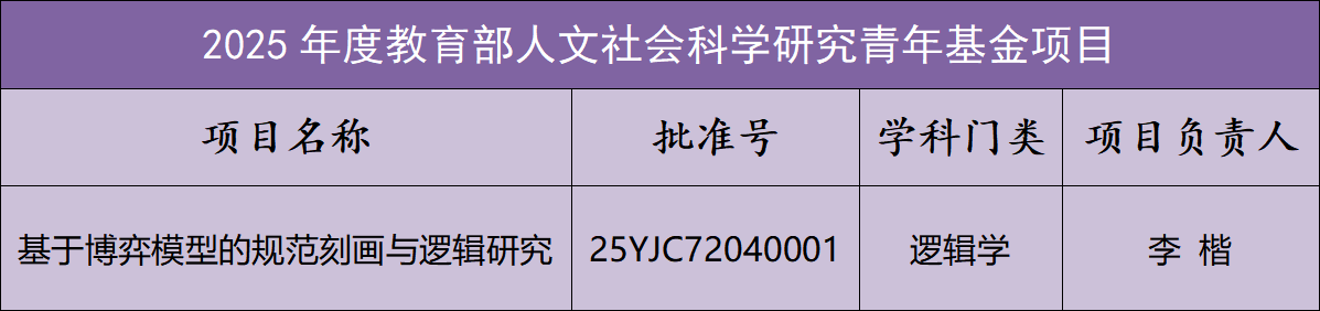 12月2日,教育部社会科学司正式公布2025年度教育部人文社会科学研究项目立项结果,公司教师李楷申报的课题《基于博弈模型的规范刻画与逻辑研究》获批青年基金项目立项。